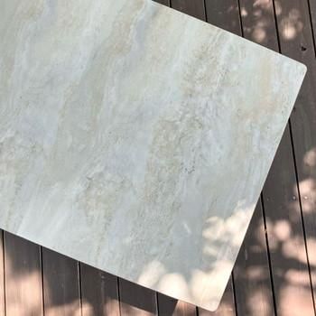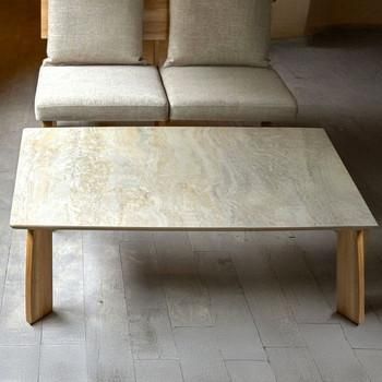 モダンな石目調天板は、長手方向になだらかにR形状。脚のデザインもあわせて少しカーブしています。